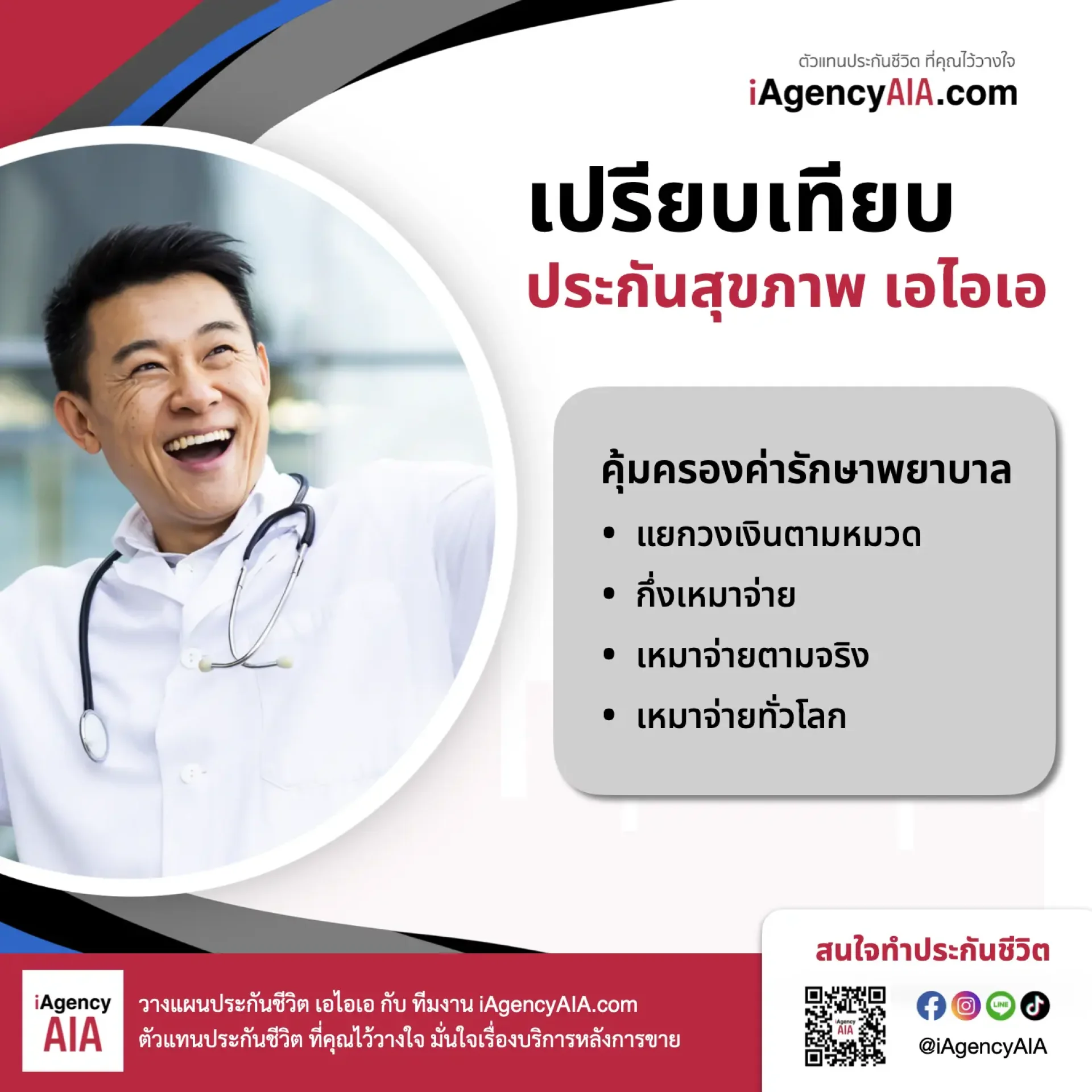 บทความนี้ ผมจัดทำมาเพื่อช่วยตอบคำถามยอดฮิตว่า ประกันสุขภาพ AIA มีกี่แบบ แบบไหนดี และ แต่ละแบบมีแตกต่างกันอย่างไร พร้อมรีวิวและตารางเปรียบเทียบแผนประกันสุขภาพ เอไอเอ แต่ละแบบอย่างละเอียด เพื่อให้คุณลูกค้าเห็นข้อดี ข้อจำกัด และเลือกแผนที่เหมาะสมกับตัวเองได้ง่ายขึ้นครับ